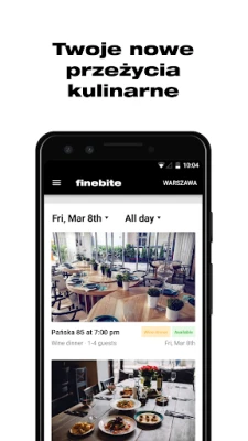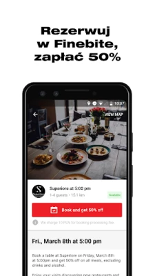 Korišćenje Finebite je jednostavno i nagrađujuće. Pretražite našu pažljivo odabranu mrežu koja obuhvata gotovo 1000 restorana u brojnim gradovima širom Poljske. Svake ponoći, otvaraju se nove ekskluzivne prilike za rezervaciju stolova do sedam dana unapred. Imajte na umu da svaki restoran nudi samo jednu jedinstvenu rezervaciju dnevno, što osigurava posebnost vašeg iskustva. Izaberite svoj omiljeni lokal, rezervišite termin i pripremite se da platite samo polovinu računa za sve što naručite sa menija.