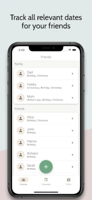 Jeste li ikada propustili važan datum voljene osobe? Zaboravili na rođendan najboljeg prijatelja ili godišnjicu koju ste obećali proslaviti? Aplikacija Gifts je tu da zauvek reši te dileme. Sa Gifts-om, možete lako registrovati sve svoje prijatelje i drage osobe, postavljajući datume i prilike koje želite da zapamtite – bilo da je to rođendan, godišnjica, praznik ili bilo koji drugi poseban događaj. Neka vam nijedan trenutak ne promakne i uvek budite spremni da iznenadite, čestitate ili jednostavno pokažete koliko vam je stalo.