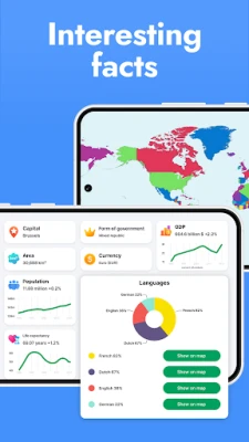 Pored zabavnih kvizova, StudyGe služi i kao vaš lični digitalni atlas. Istražite detaljnu političku mapu sveta, sa precizno označenim lokacijama i granicama 233 države. Pregledajte specifične informacije o svakoj zemlji, uključujući njenu zastavu, glavni grad, zvanični jezik, broj stanovnika, valutu i oblik vladavine. Aplikacija takođe nudi dodatne module, poput detaljnog prikaza država Sjedinjenih Američkih Država, sa svim relevantnim podacima. Pripremite se da blistate u svim popularnim kvizovima znanja, poput „Šta, gde, kada", ili sličnim takmičenjima, osećajući se kao pravi erudita. Geografija je zabavna i pristupačna uz StudyGe!